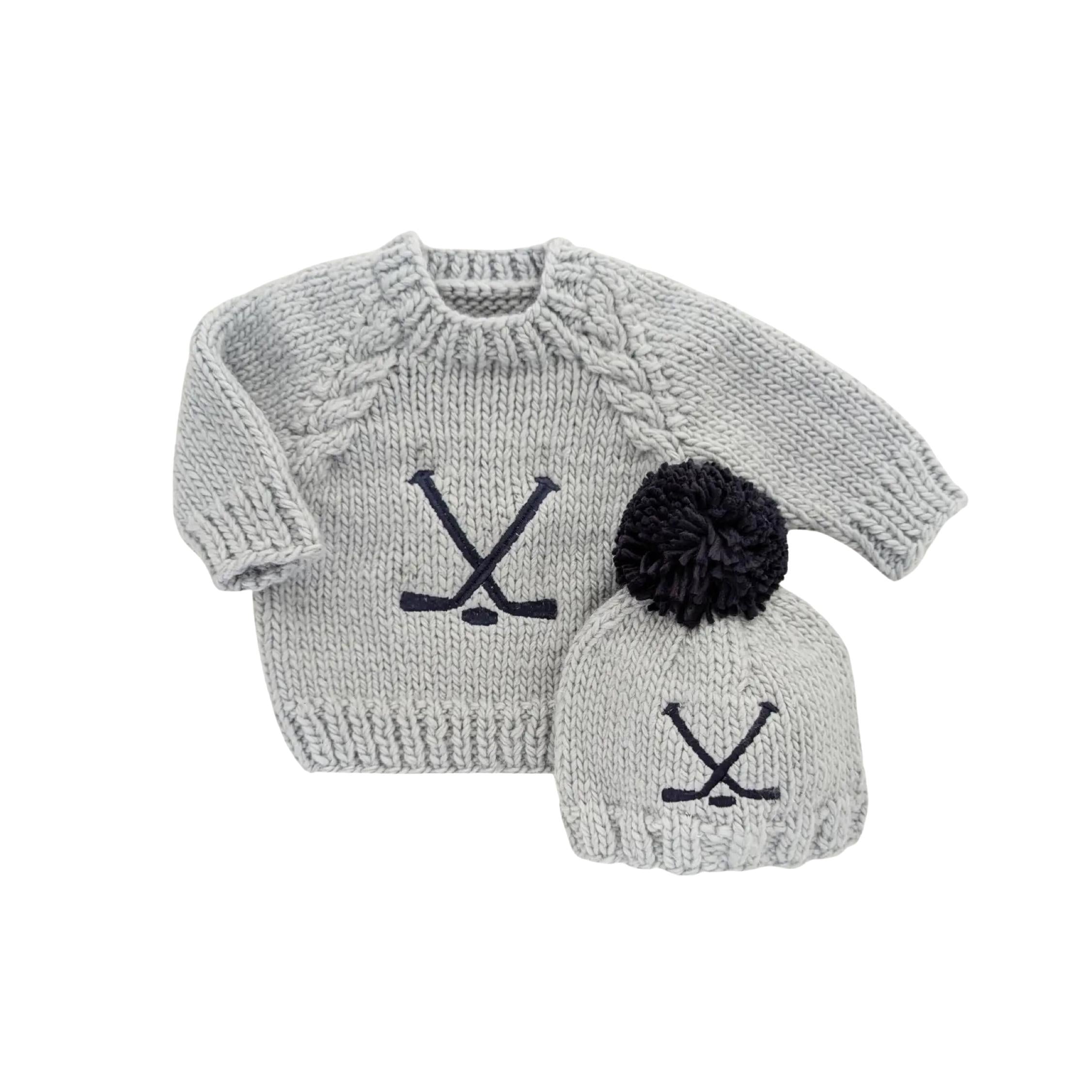 Keep him warm on and off the ice with this playful hand-knit pom hat. Crafted from thick, soft Ice Grey yarn, it features charming indigo blue embroidered hockey sticks and a puck, plus a fun indigo pom pom on top. Perfect for cozy winter days with a sporty twist!