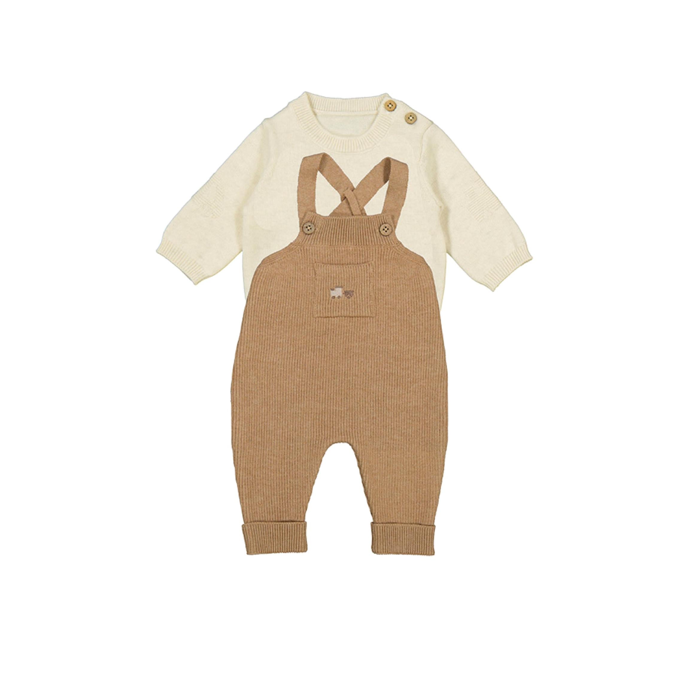 This elegant heirloom gift set features a toffee-colored dungaree with a charming train motif on the chest pocket and front button closures on the straps. Paired with an ivory long-sleeve knit sweater that includes convenient shoulder buttons, this two-piece ensemble offers both style and comfort, making it a refined choice for welcoming a new baby boy.