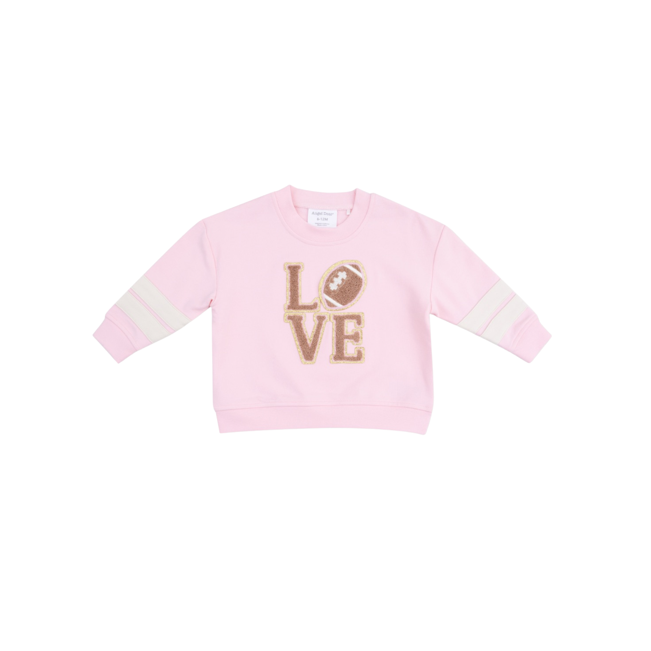 Your little gaI will love wearing our new pink Cozy Drop Sleeve Sweatshirt to kick off the cozy clothing season! This adorable sweatshirt features classic varsity stripes and a sweet “Love” applique where a football cleverly replaces the “O” to celebrate the football season in style. Made from soft French terry, it’s perfect for game days, playtime, or snuggling up at home.