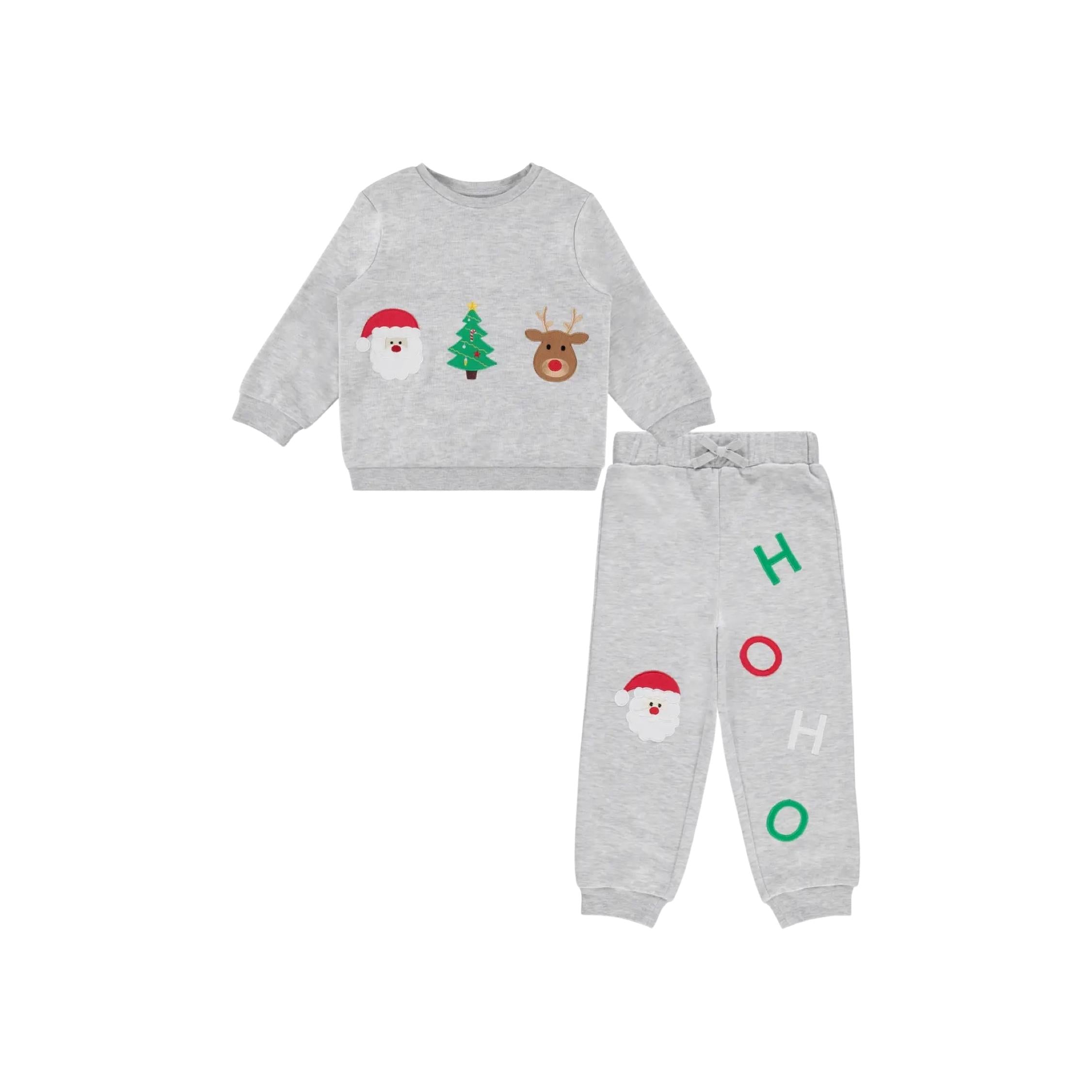 This playful two-piece set combines softness and festive cheer with a grey knit sweatshirt adorned with charming Christmas appliqués of Santa, reindeer, and a Christmas tree. The matching pants with elastic waistband makes dressing a breeze. This unisex outfit brings cozy comfort and holiday spirit for your little one’s joyful moments.