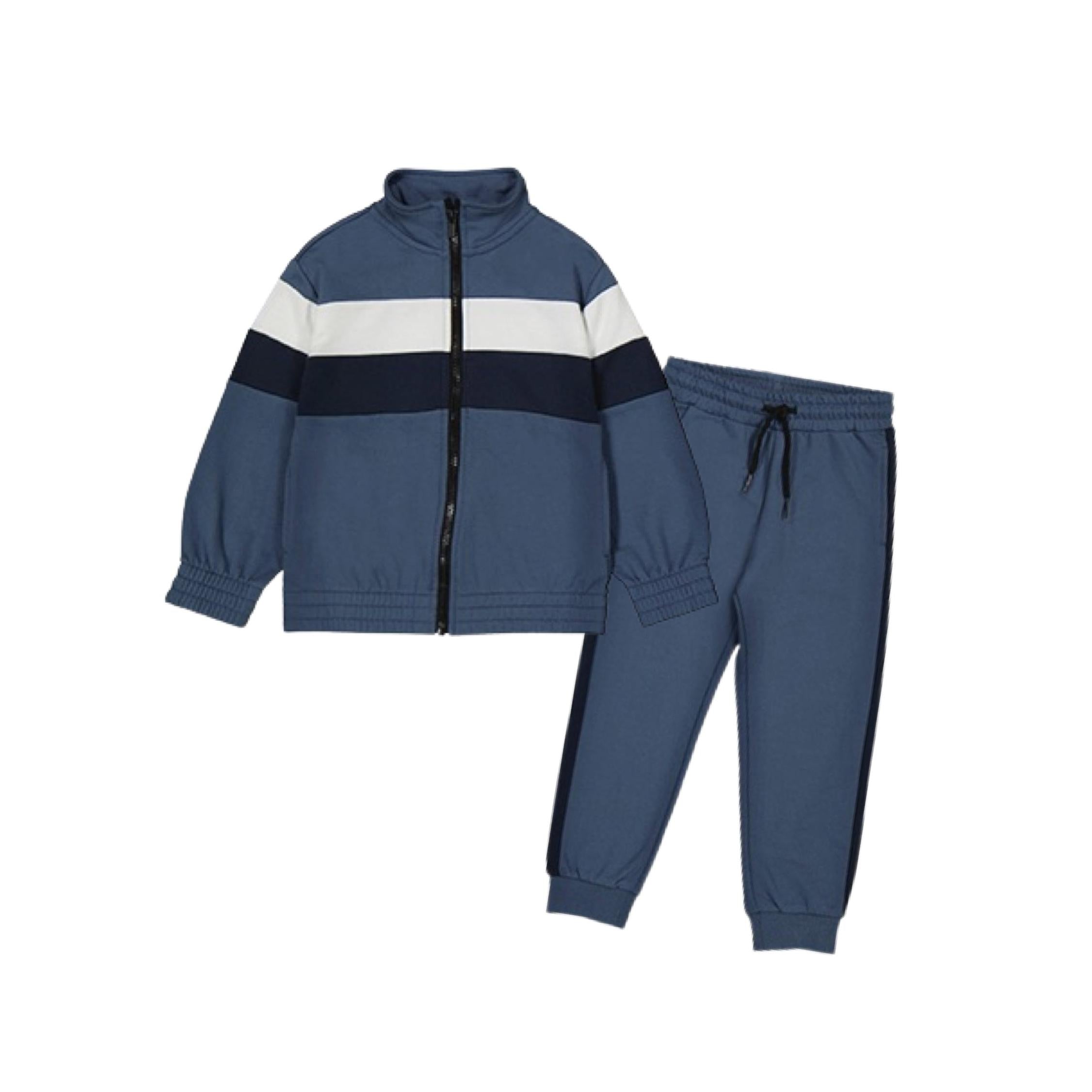 This steel blue 2-piece tracksuit for boys features crisp white striping across the jacket for a sporty look. The pants elastic waistband with drawstring ensures a comfy, adjustable fit, while ribbed ankles and wrists keep the outfit snug during playtime adventures. Perfect for active days filled with fun and movement!