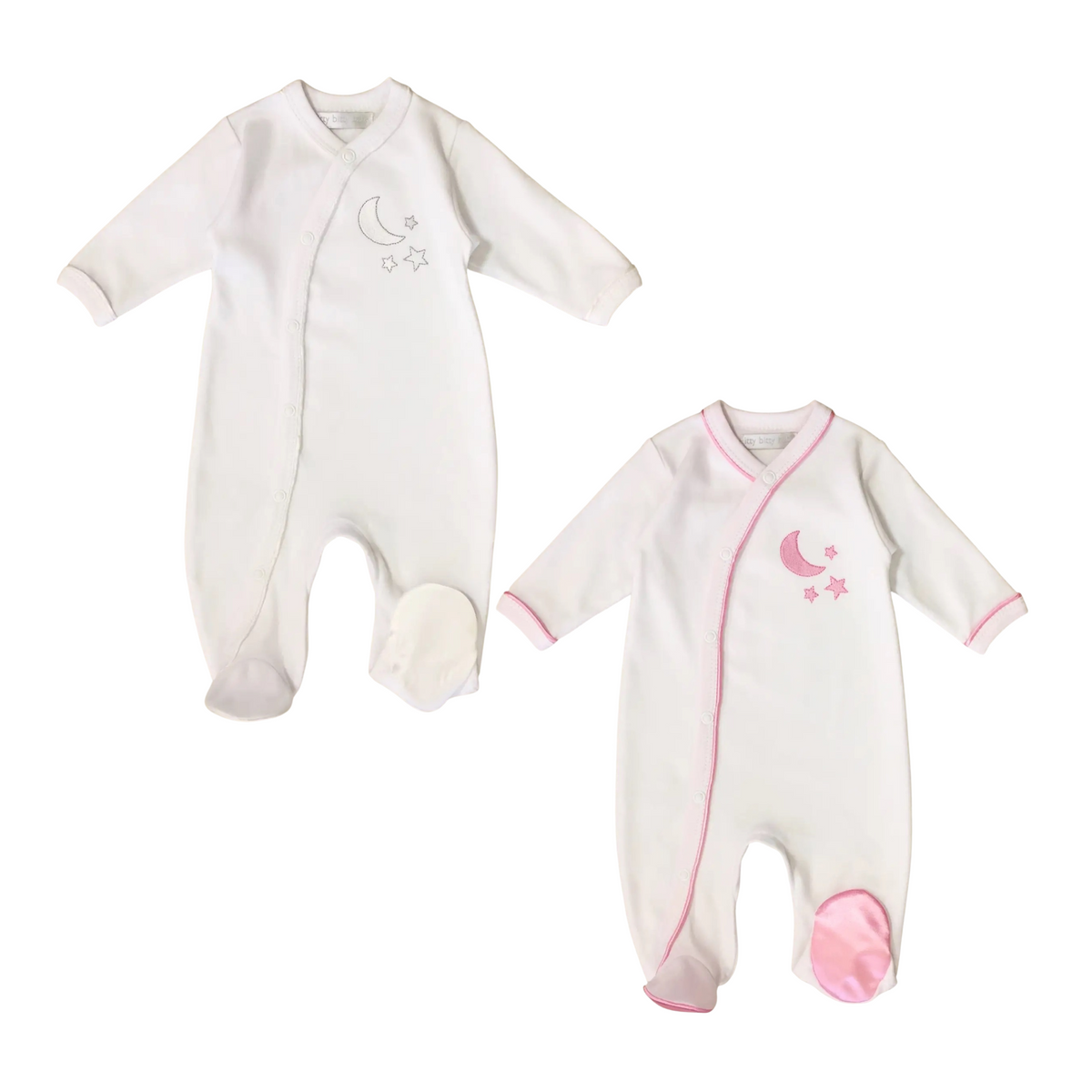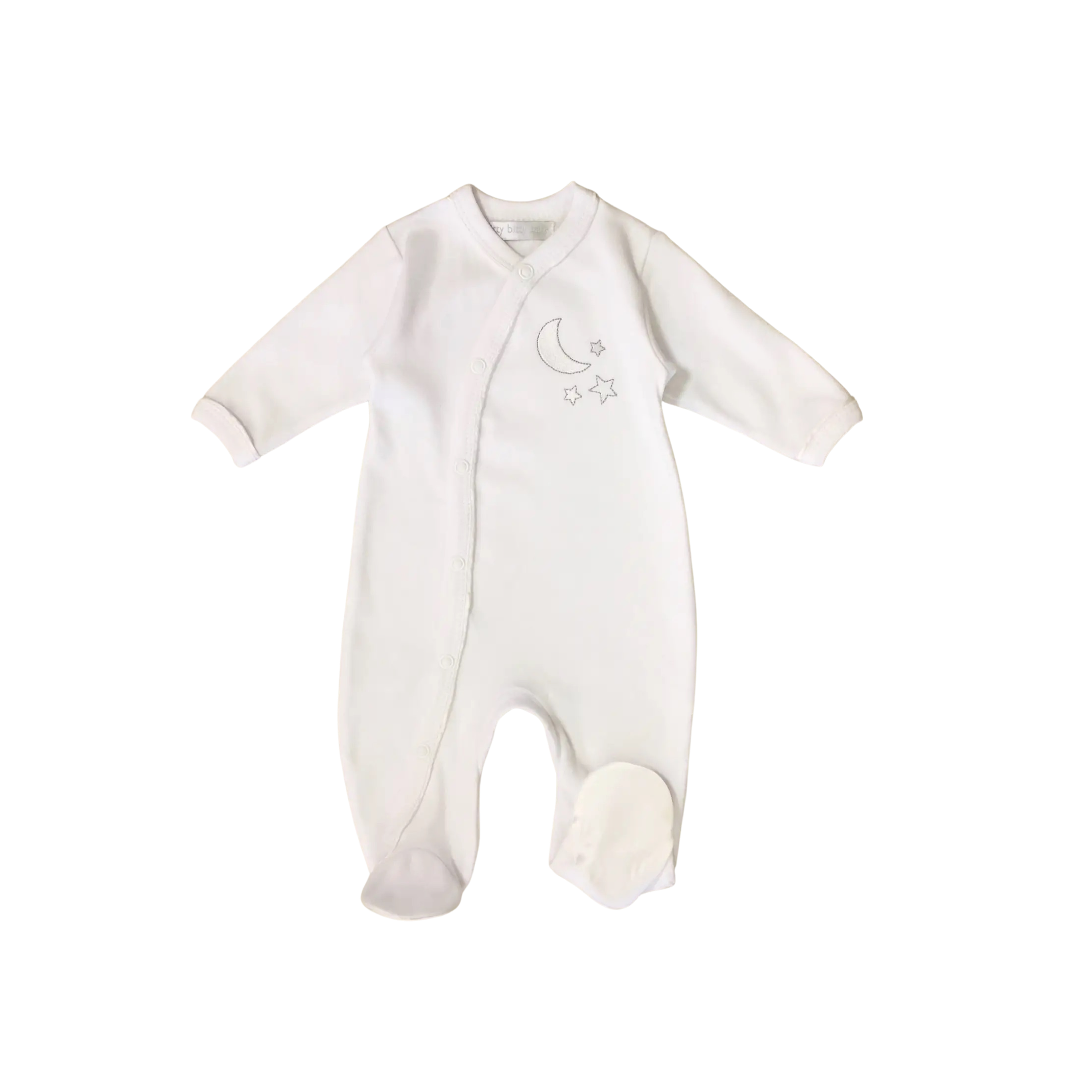 This sweet little footie is not only cozy and soft it has accented satin feet and piping. Embroidered stars and moon are featured on the front. Snap closures down the front and leg ensure easy changes. Front & leg snap opening allow for easy diaper changes. Elegant and adorable!