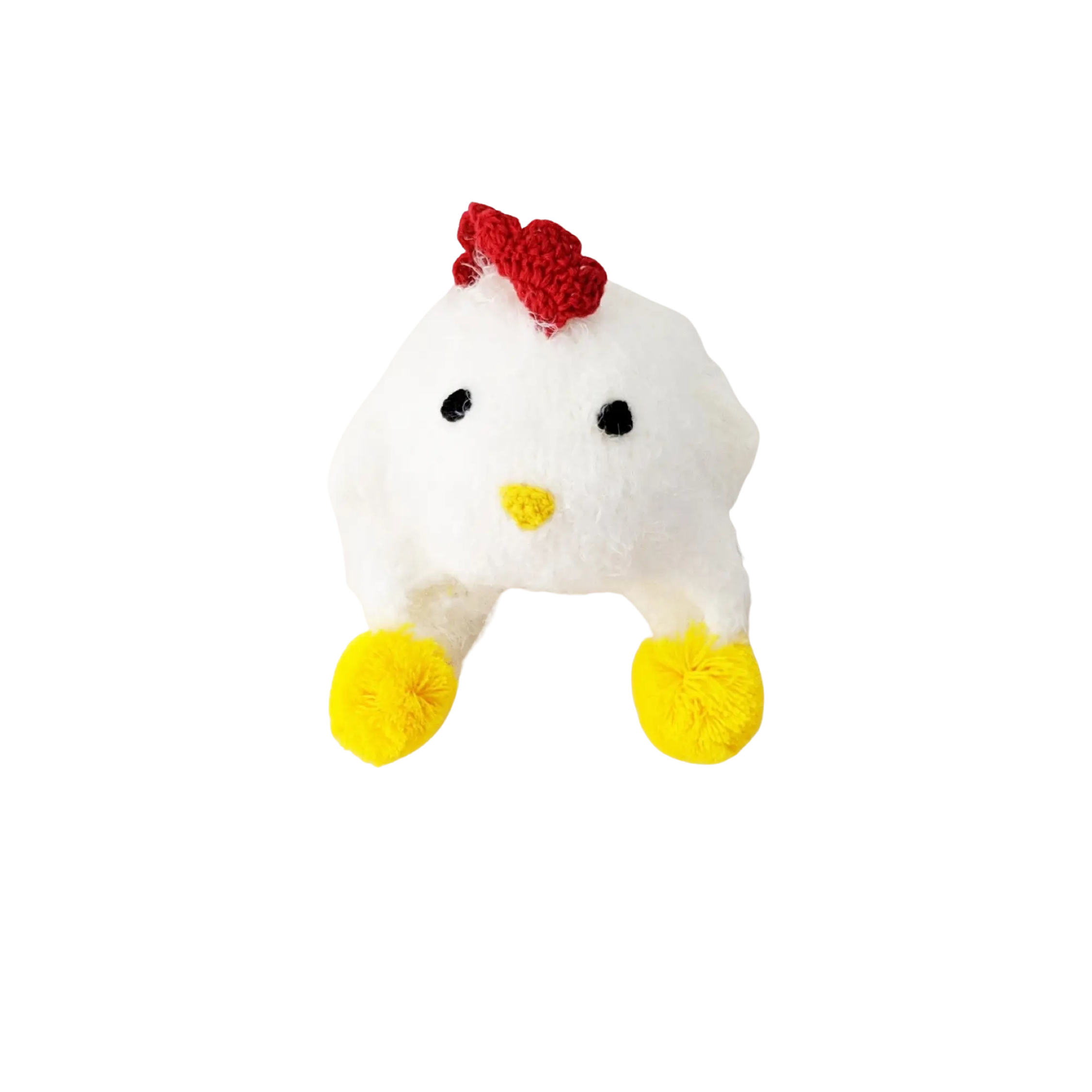 Our cute chicken beanie is perfect for your little chick! Hand knit in ultra-soft white yarn this hat features earflaps trimmed in fluffy yellow pom and is topped with a red comb accent. Your little kiddos will have fun keeping warm!