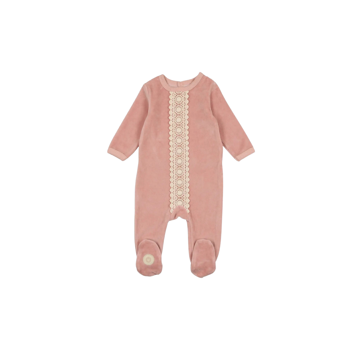 Indulge your little one in luxurious comfort with our Mauve Grace Of Lace Footie. This velour footie is so soft and is delicately accented with a lace strip down the center. Your baby girl will feel pampered in this darling piece. Perfect selection for your Babylove Registry or to give a a beautiful heirloom quality gift.