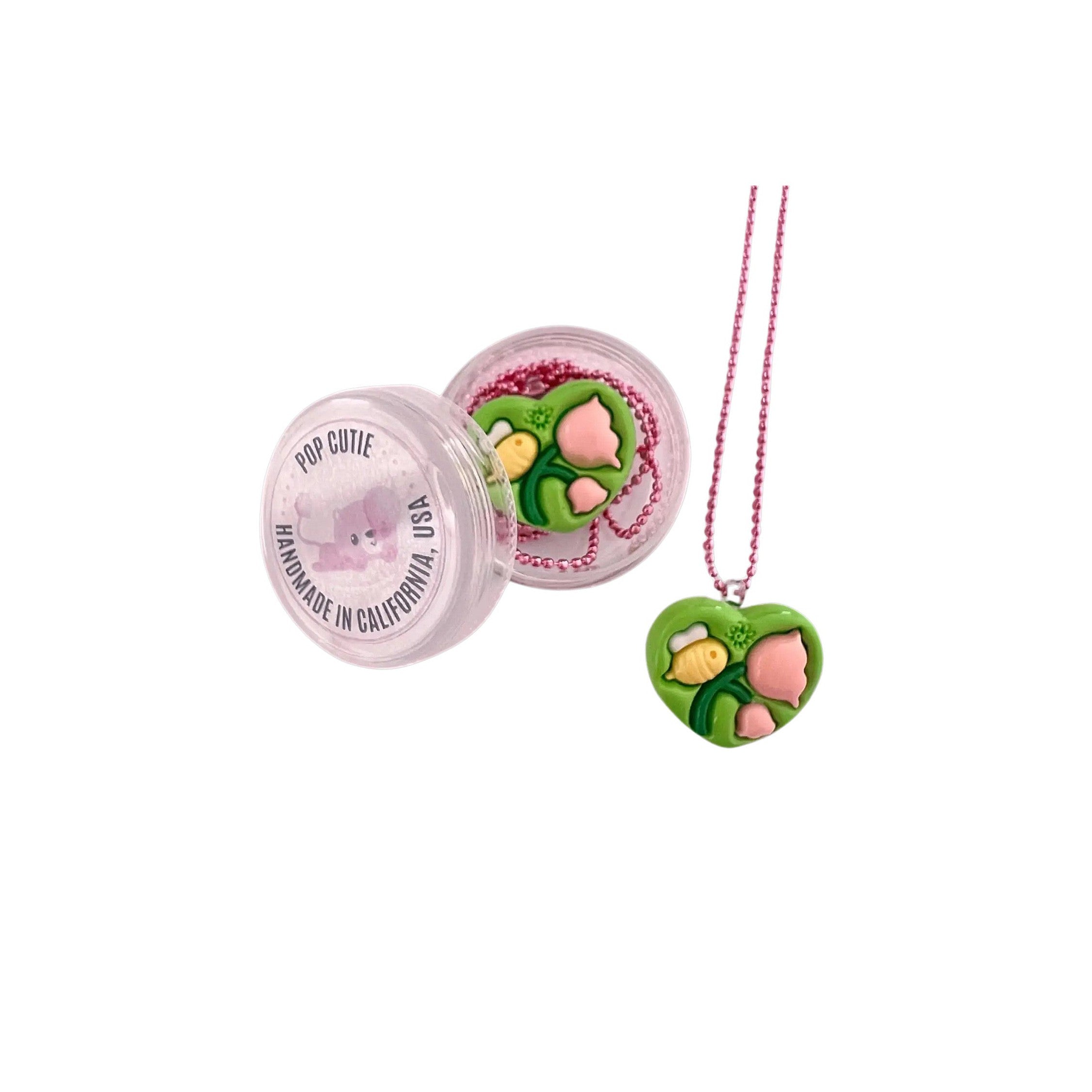 Elevate her fashionista game with the Pop Cutie Bee Heart Necklace. This handcrafted necklace boasts a charming green heart pendant with a playful bee and flower design. Comes with a pink ball chain and an acrylic gift box with our cute logo. Get ready for compliments!