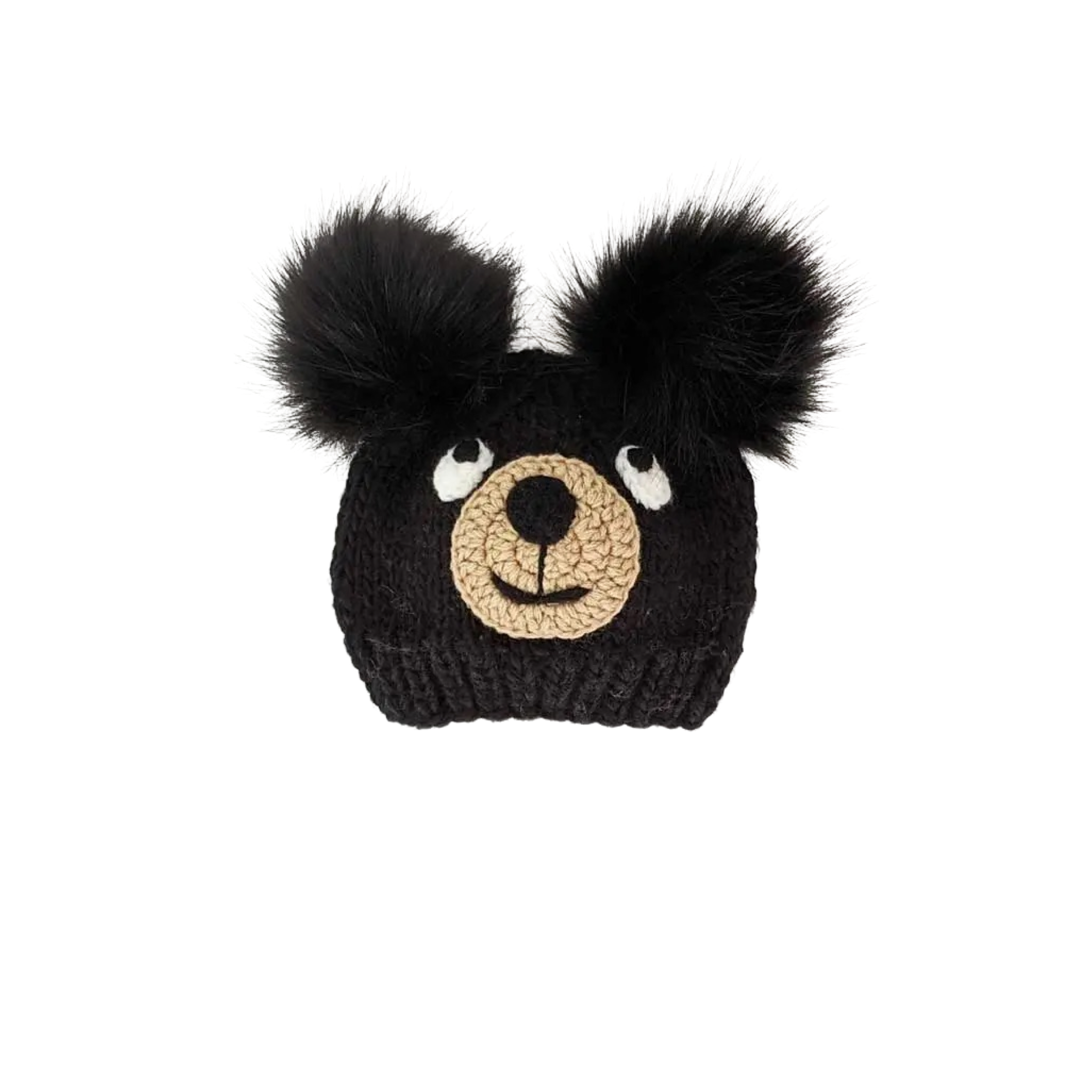 Our black bear beanie is too cute! This cozy warm hat is hand-knit, made with black yarn and accented with crocheted eyes and nose. This fun beanie has furry pom ears! Perfect for everyday wear for those little ears. Coordinates well with our other cozy hand-knit items!