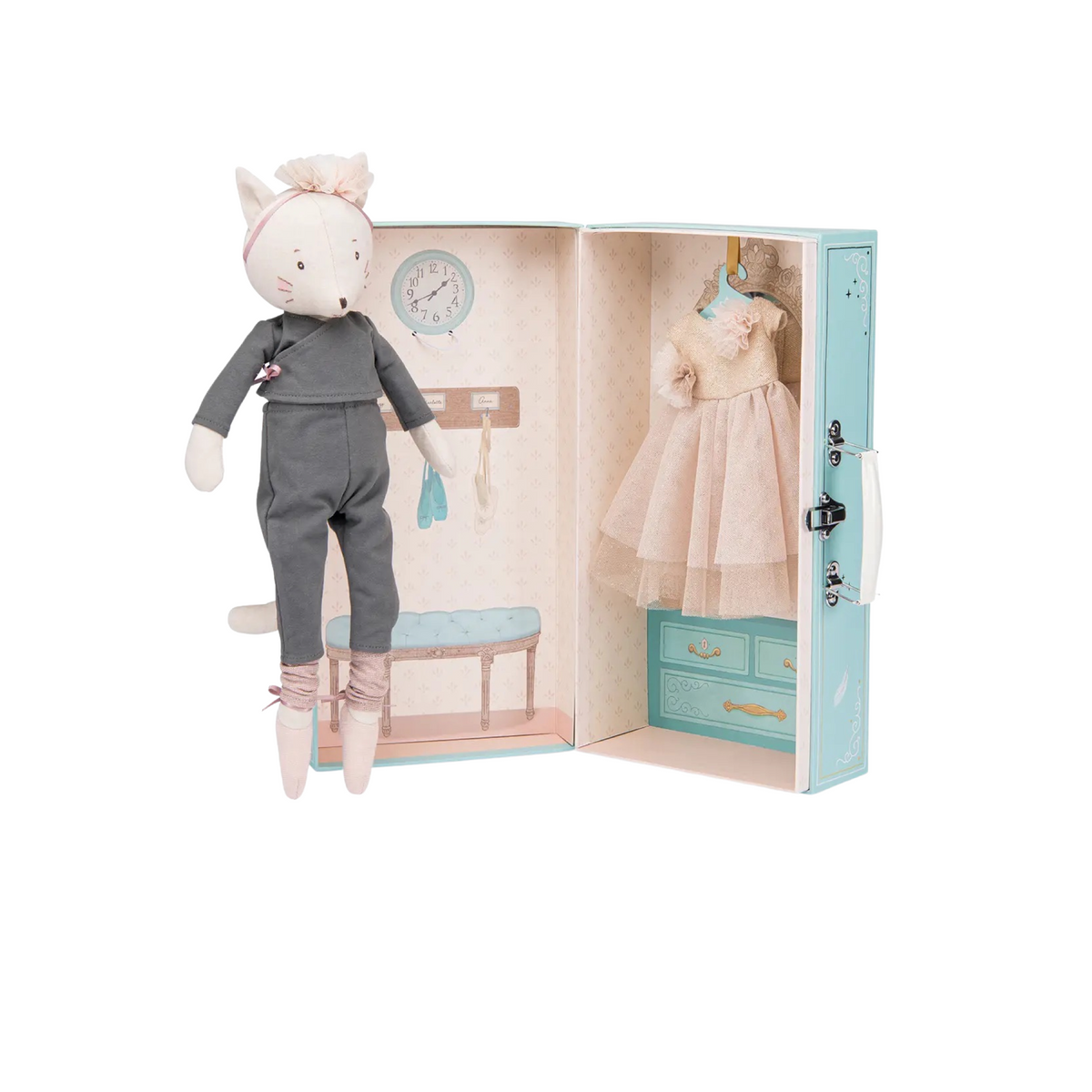 In this new heirloom collection, Celestine the cat doll beckons us for a peek inside her wardrobe. A wardrobe suitcase complete with acrylic unbreakable mirror, containing a warm-up outfit and a gala gown on a hanger. Small steps, pas de deux, pas de chat... there's practice to be done before the end-of-year show!