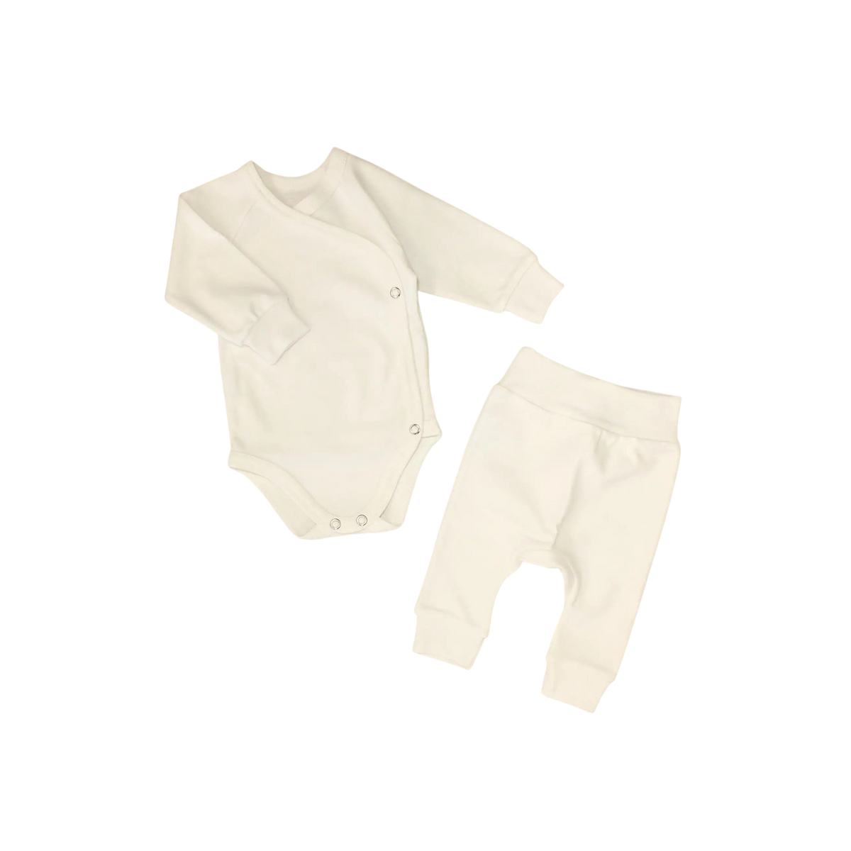 A perfect take-me-home layette for the tiniest of the tiny. Woven in Canada from 100% cotton interlock the kimono style bodysuit is designed for easy changing & the harem pant features a wide comfy waistband for easy removal. Add one of our beanies + swaddles and your bundle is ready for the ride home.