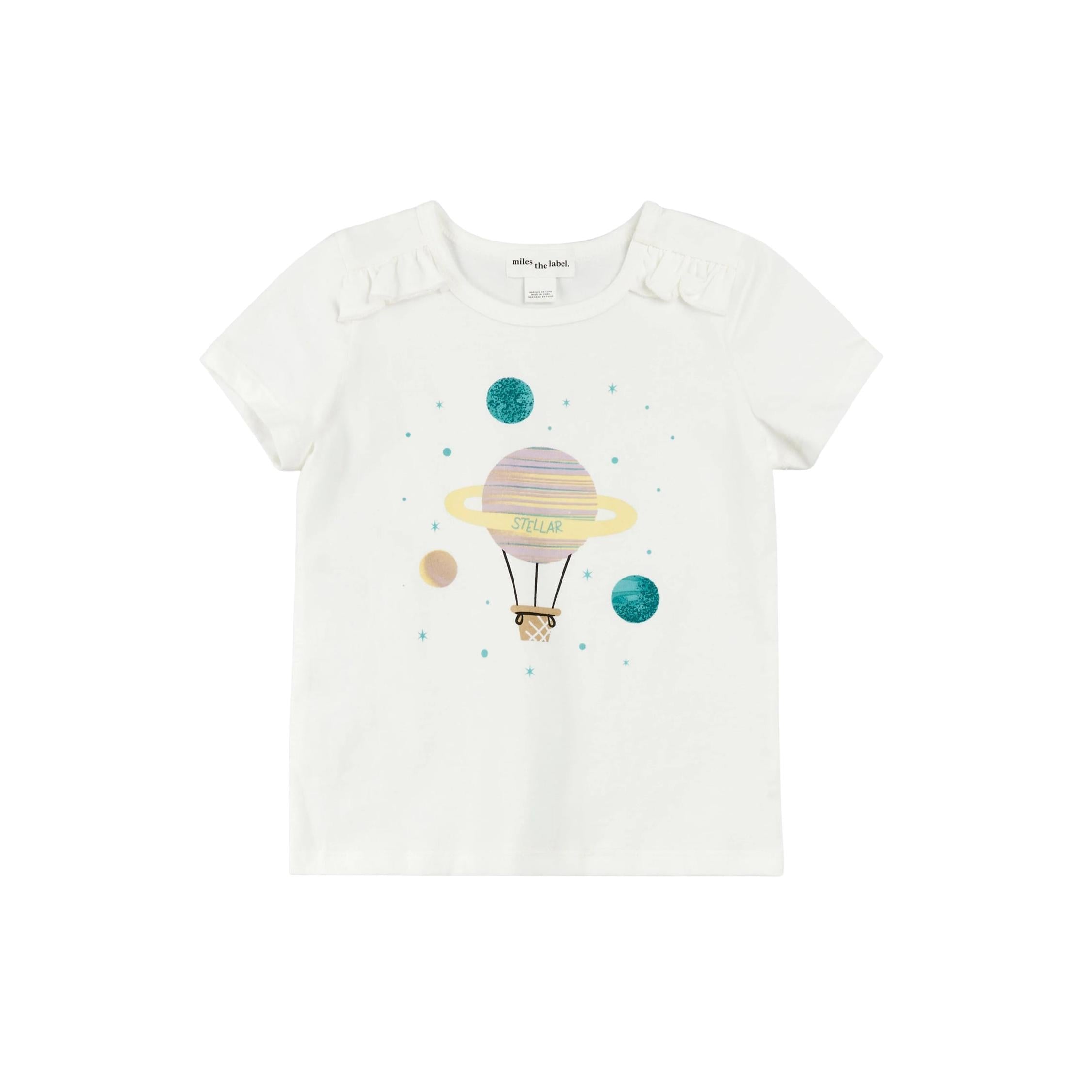 Take flight in style with our Hot-Air Balloon Print T-Shirt! Perfect for daydreamers and stargazers, this top is made from soft, breathable organic cotton and features a frilly trim along the shoulders for a playful touch. The button placket at the back makes getting dressed a breeze. Pair with our Miles Basics leggings or biker shorts and soar to new heights!