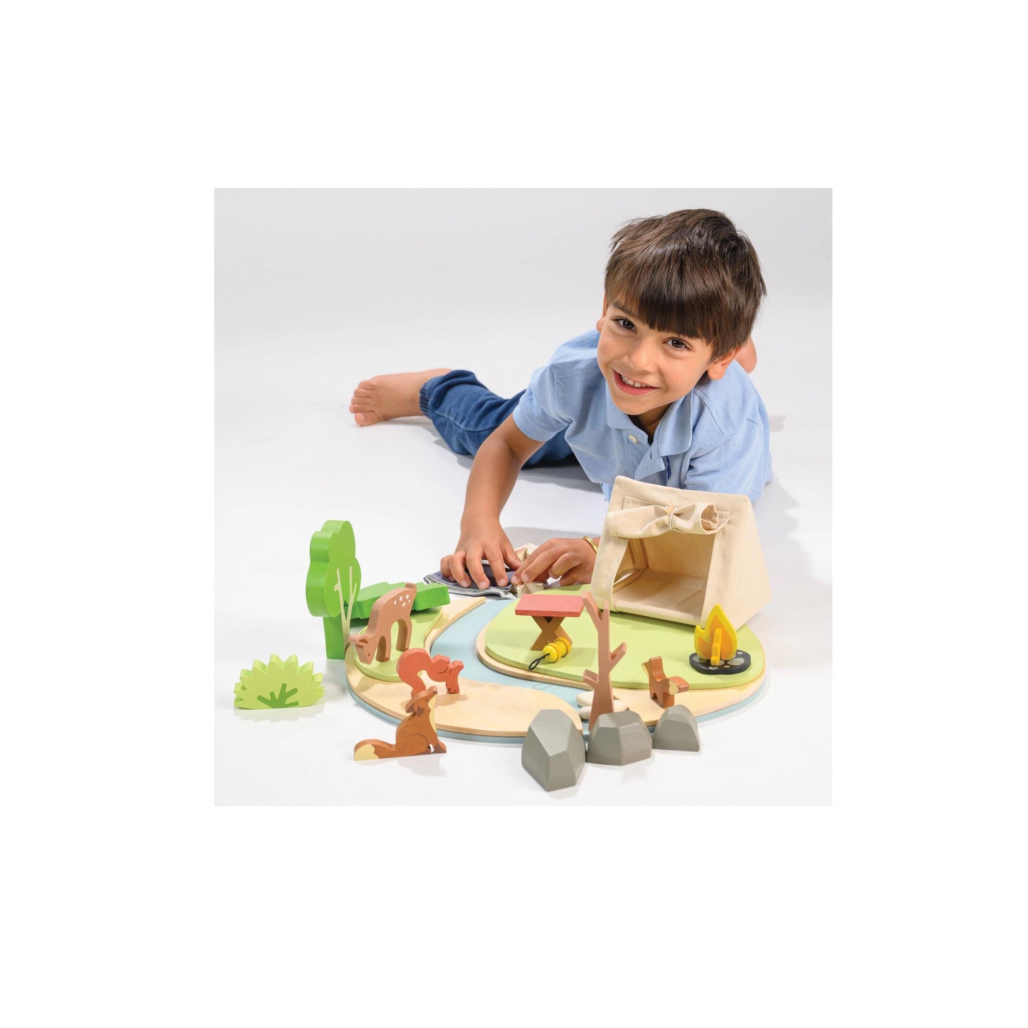 This Wooden Wildlife Camping Play Set is perfect for imaginative play and storytelling. Scaled for dolls house world, it includes a cosy sleeping bag, lamp, water bottle, and fishing rod. Build a small campfire and watch the wild forest animals come to play. Includes a camping poster with real tips and advice. Go wild!