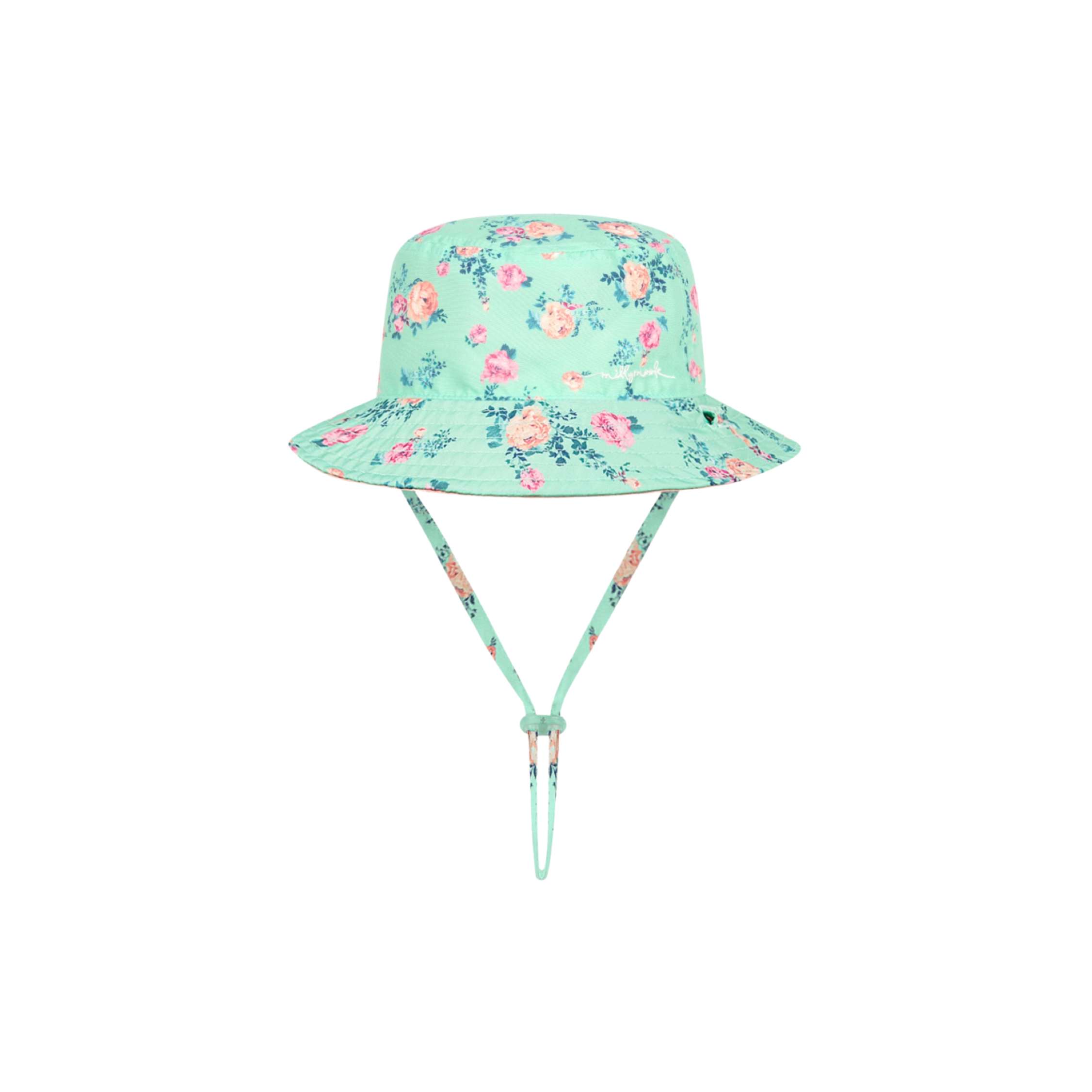 Protect her noggin’ this season in this pretty minty green garden rose print bucket hat that features a reversible design, classic fit, and a detachable drawcord. A perfect hat for sun and sand.